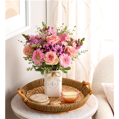EXCLUSIVE Get them buzzing! A glorious mix of blooms in shades of pink and lavender, our eye-catching bouquet dazzles with color and texture. Designed in our Sweet As Can Bee artisanal vase, featuring an adorable honeybee, and accented with a raffia bow, it’s a gift that adds charm and beauty to any decor.